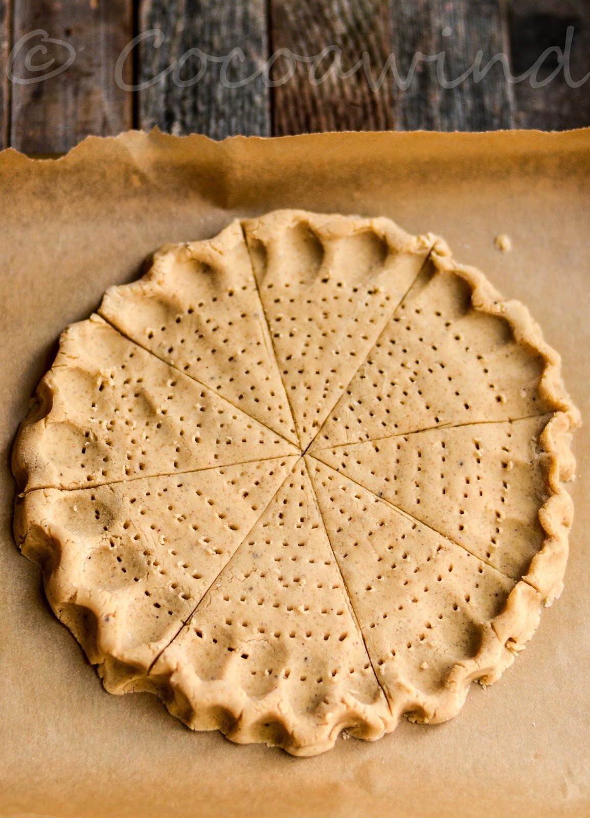 Pat it into roughly a eight inch circle about 1/4 inch in thickness. Now take a fork and poke holes on the surface. Use your fingers or a spoon to crimp the edges and using a sharp knife and cut into 8 equal wedges
